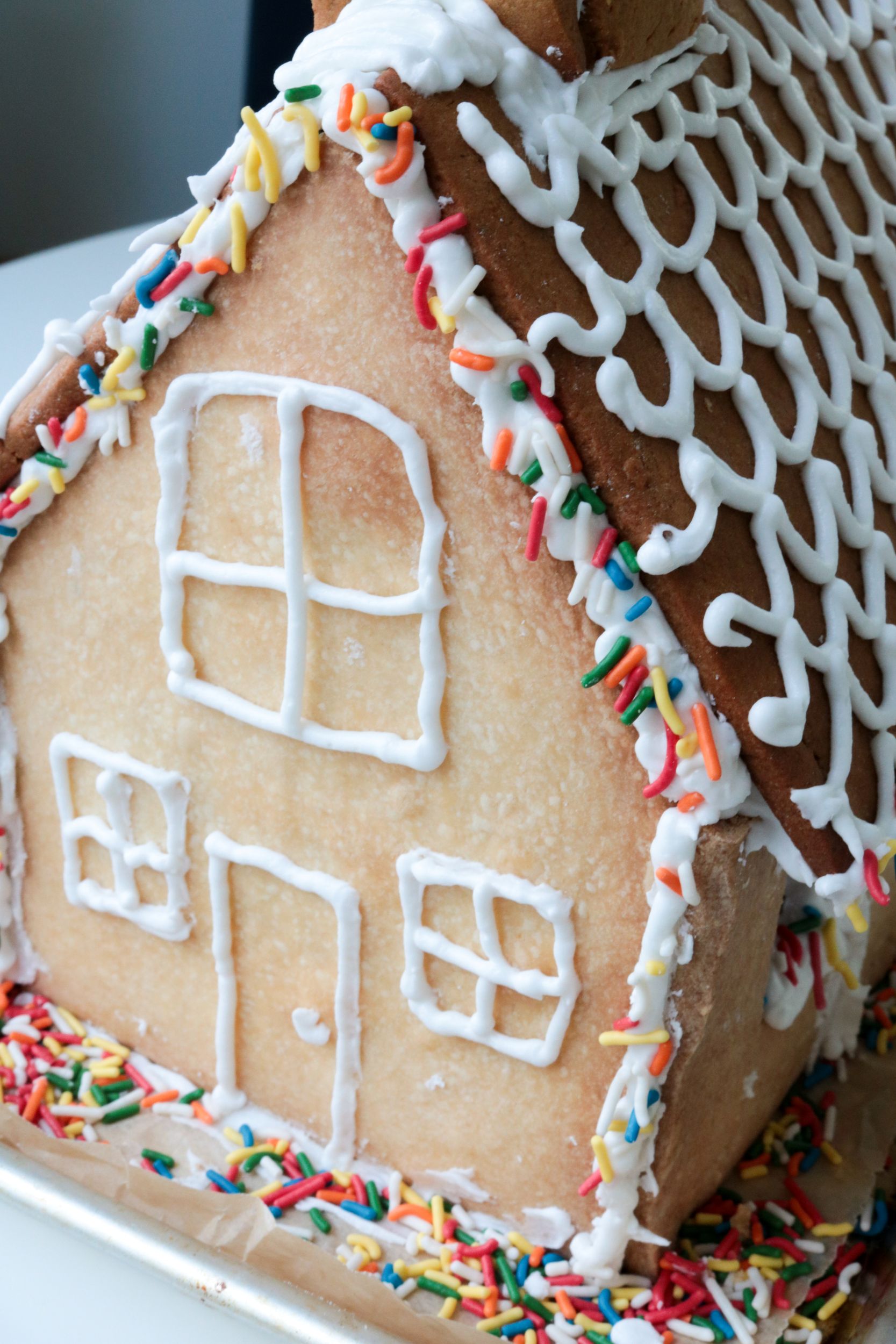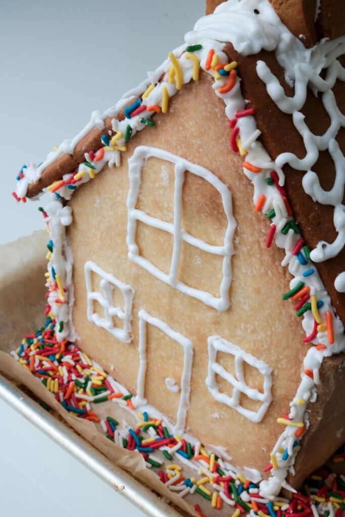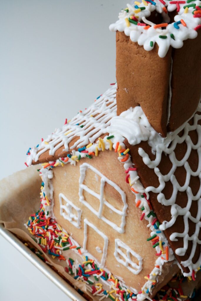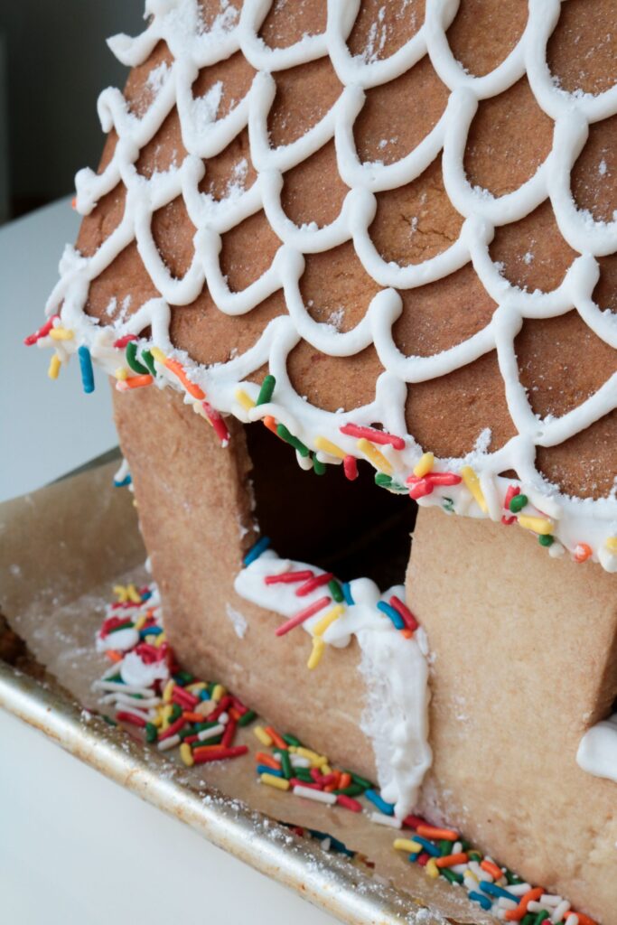 I piped on a door and windows that have… no right angles. Then, I started piping on the roof tiles. But then my hand started cramping, and the tiles started looking incredibly wonky. I threw on some sprinkles and pretended they looked like lights and called it a day. I was exhausted. And humbled.