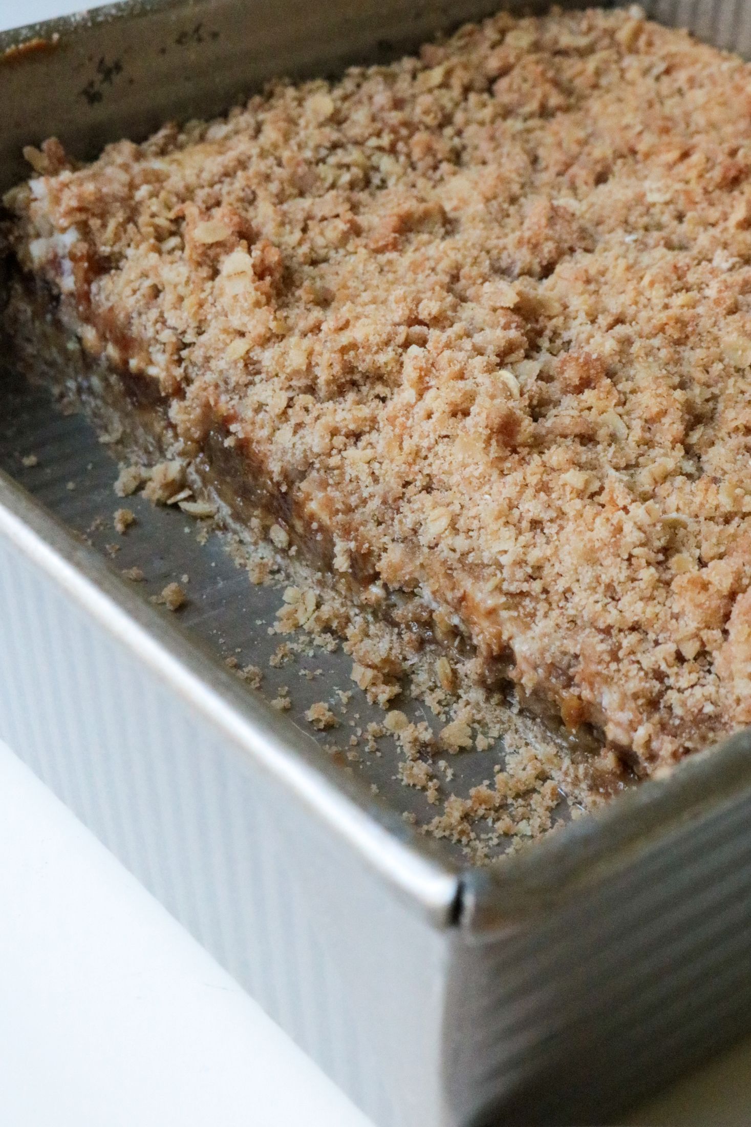 - Finally, crumble the reserved crumb mixture on top of the filling.