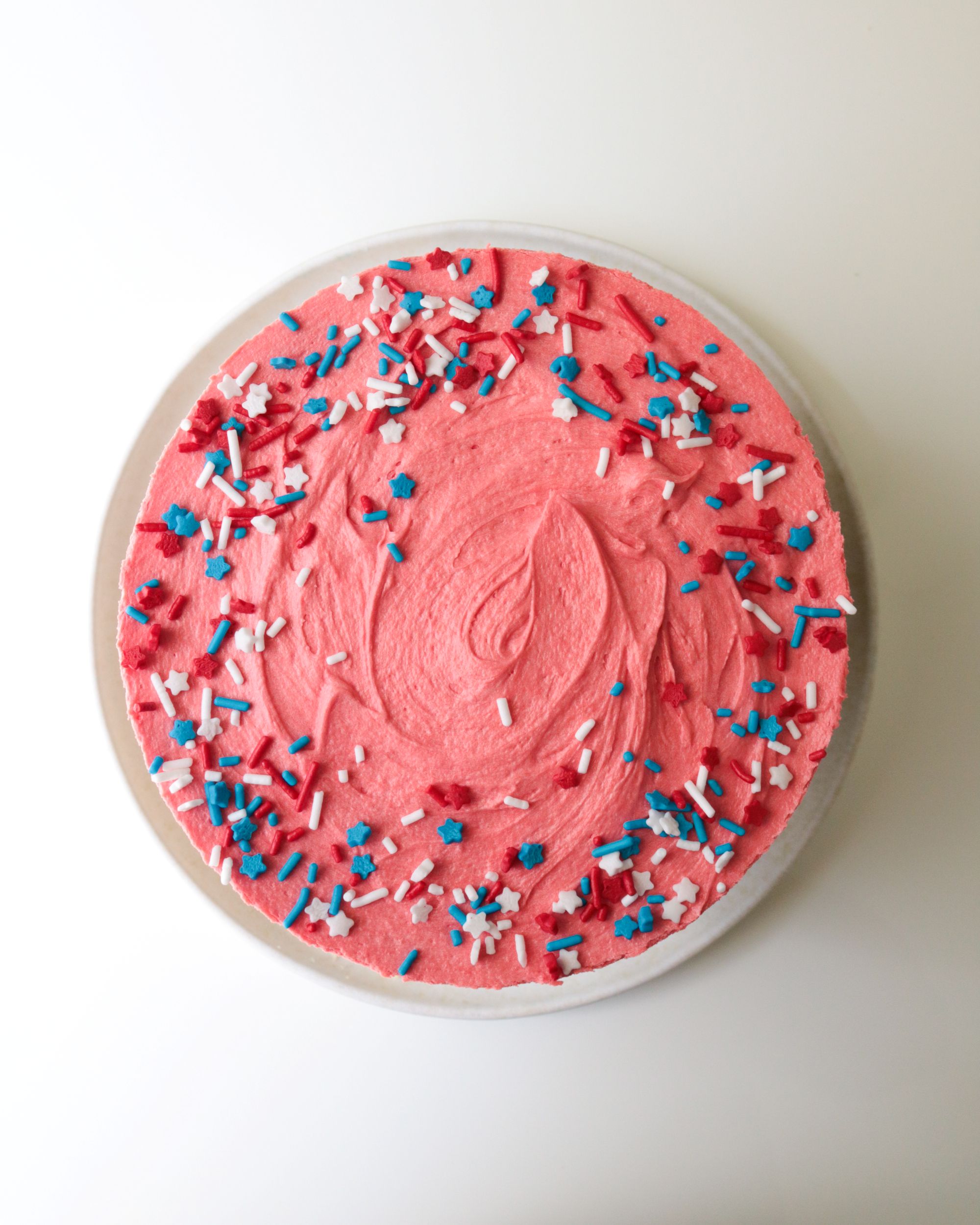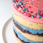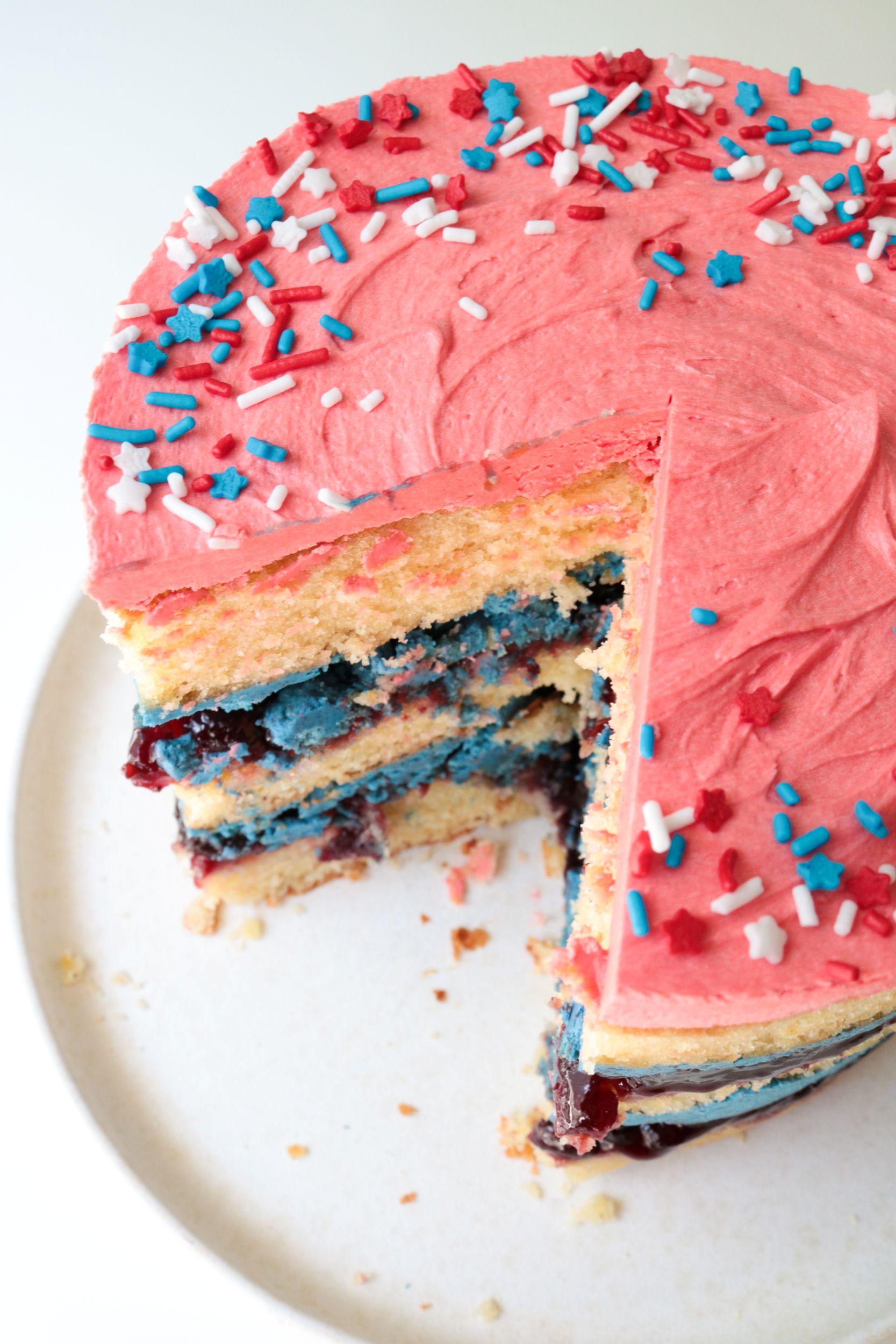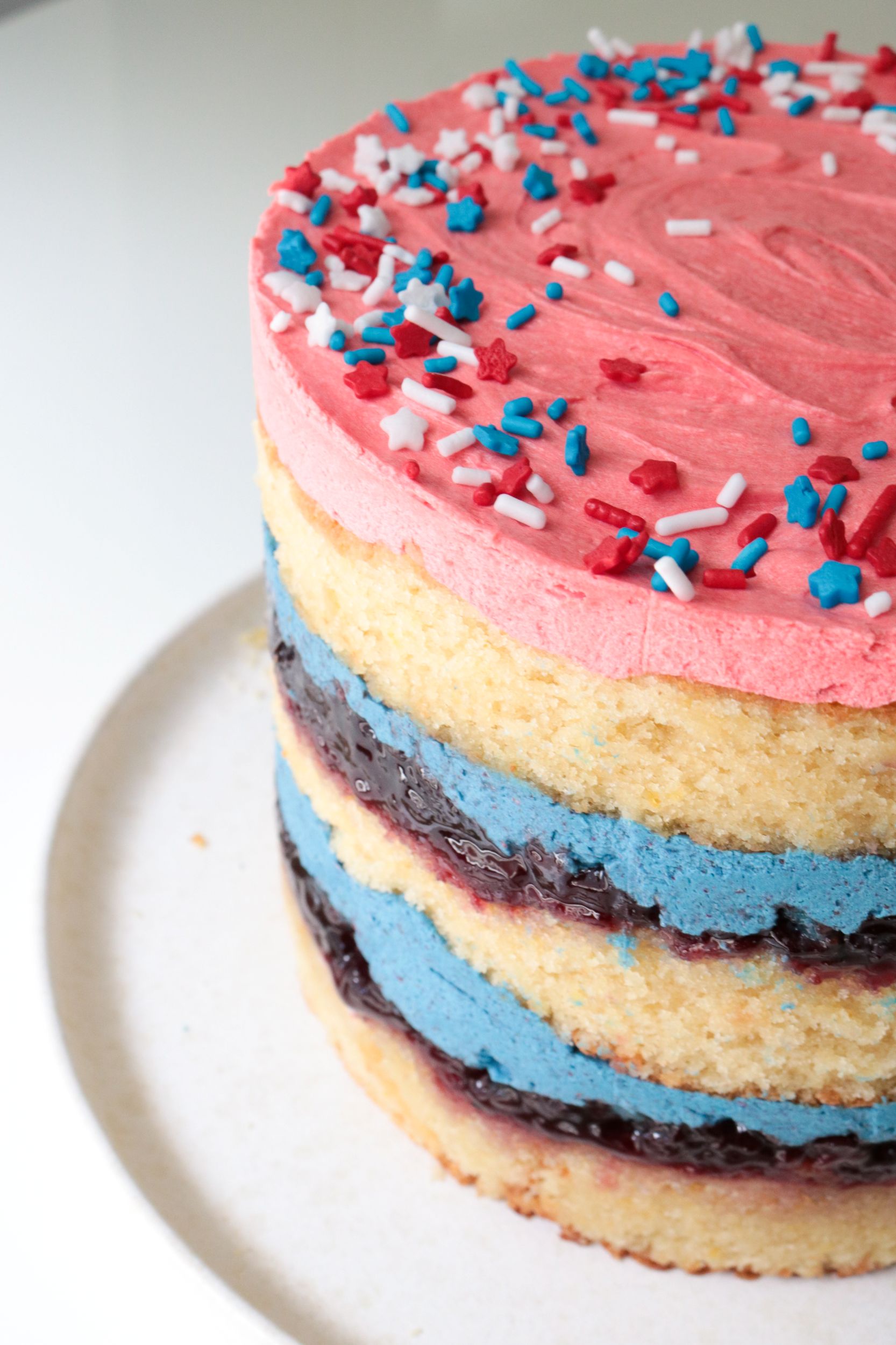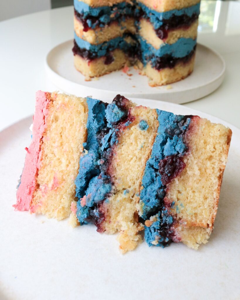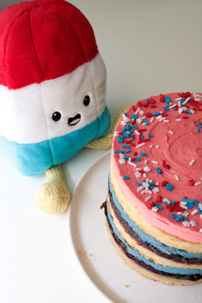 I, of course, dyed the raspberry parts blue, to be authentic to the Bomb Pop colors. That is the most important part of the popsicle, after all. In a Bomb Pop, I think the lemon is the most true-to-natural flavor, and it’s very strong. The blue raspberry tastes good, and then the cherry has the most artificial/candy taste to it. In this cake, I just used cherry jam, so it didn’t get the artificial cherry taste. But I think it tastes a bit more “grown up” and makes the cake taste a bit more gourmet than the popsicle!