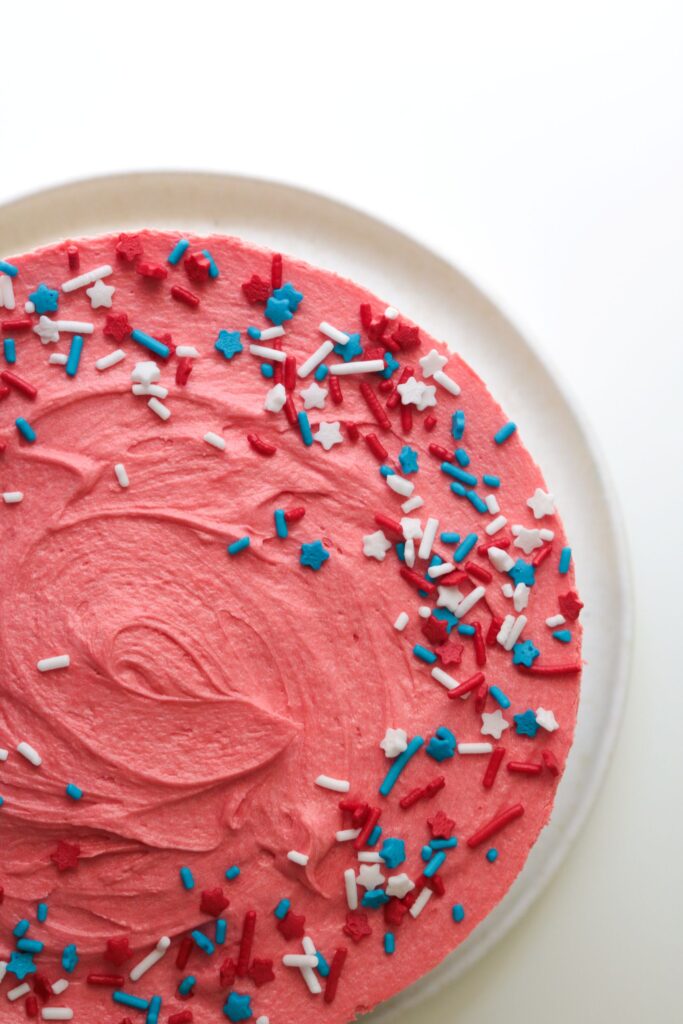 Bomb Pops are the ultimate nostalgia treat, and I’ve been glad to see them start getting their due in recent years. There’s all sorts of bomb-pop flavored energy drinks and sparkling waters and seltzers. And while those may be a bit gimmicky, I won’t complain to see the flavor offered! There’s something about those flavors that work just so well even, or maybe especially, as artificial flavors. But this Bomb Pop Cake is not artificial in any way! I tried to capture the bomb pop flavor by just combining the lemon, cherry, and raspberry flavors that make the popsicle.