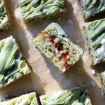 - Once the bars are cool, melt your white chocolate until smooth. You can add a 1/4 tsp of matcha powder to half of it if you’d like to have two drizzles.
