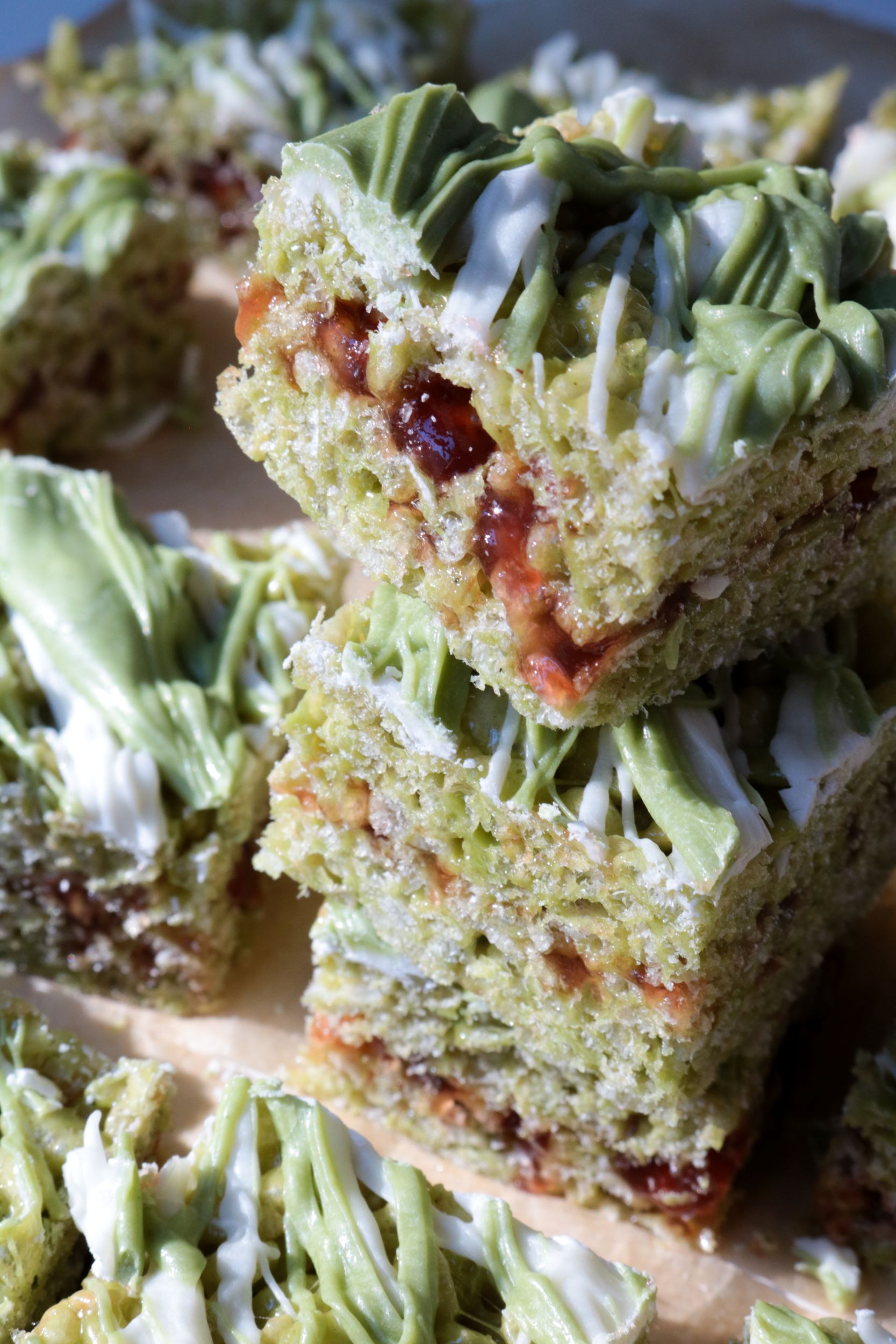 These Matcha Strawberry Rice Krispie Treats came together like it was kismet. I needed to get rid of some extra Rice Krispies after making these Pistacharoos. I asked my brother for flavor ideas, and he suggested matcha. And when I realized I had some leftover strawberry jelly in the fridge to use up, I remembered these PB&J Rice Krispies. So it came together very quickly and, frankly, obviously. I simply had to do it.