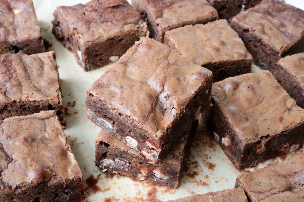 - Spread batter into a 9-inch, lightly greased, square baking dish. Bake for 30 minutes. Cool completely before cutting.