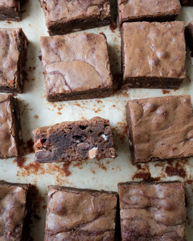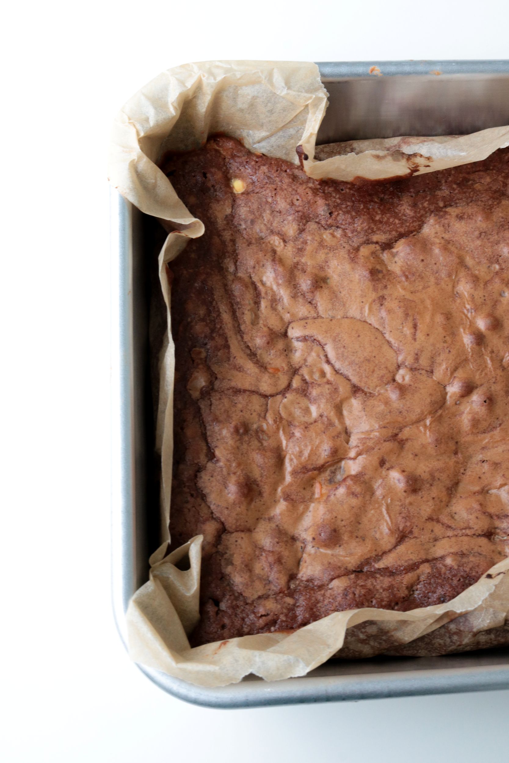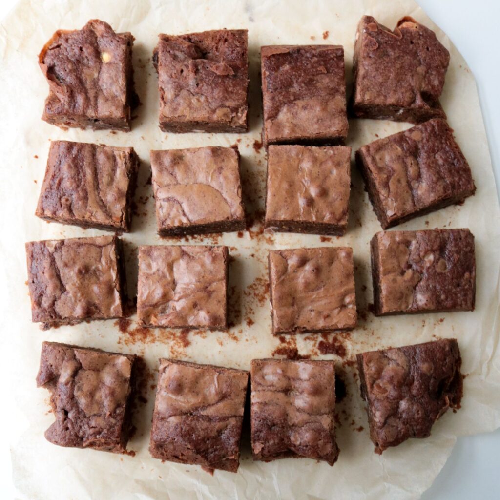 - Preheat the oven to 350F degrees and line a 9×9 square pan with parchment paper.
