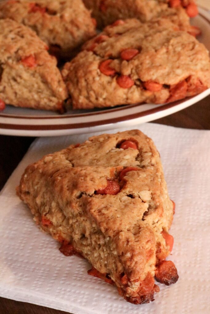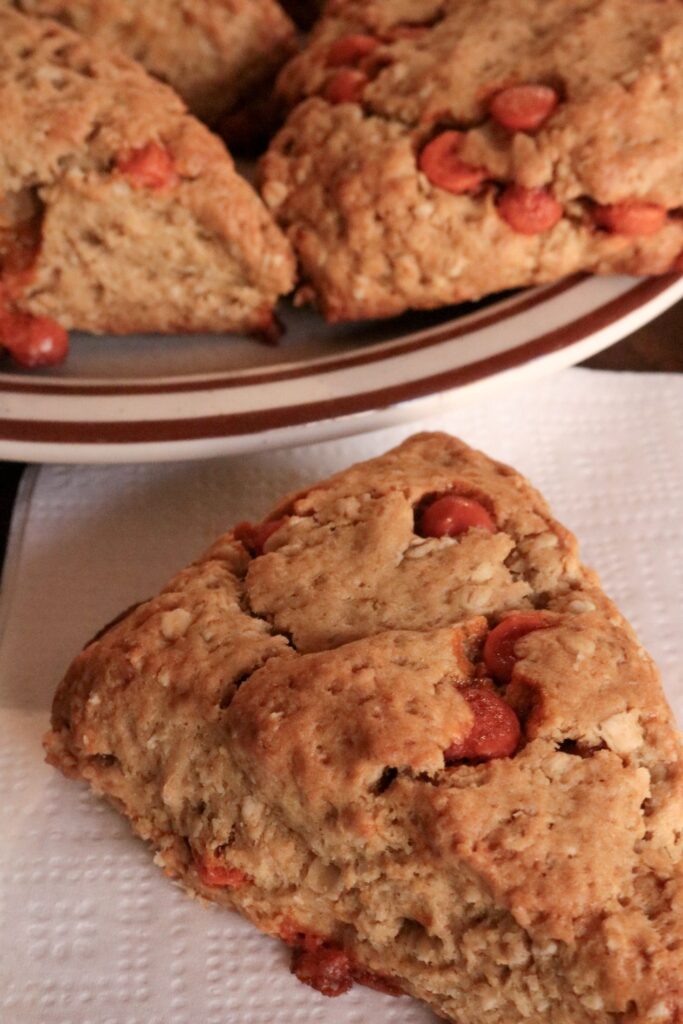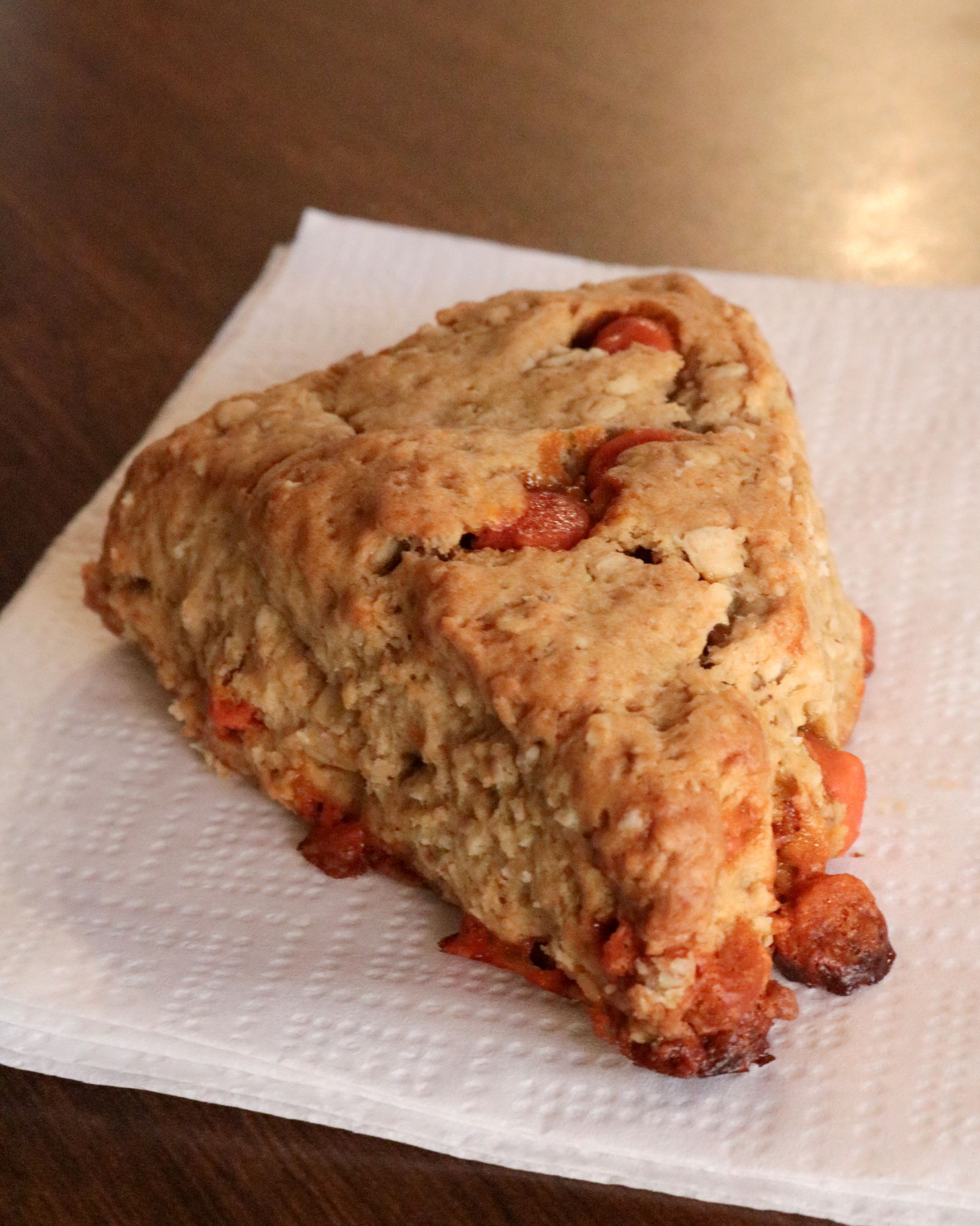 I think I’ve said it on this blog before, but peanut butter and maple are a fantastic and under-rated combination. I learned this as a kid, putting peanut butter and maple syrup on my Eggo waffles. Incredible way to start the day. These are a grown up spin on that – the peanut butter oatmeal base is more subtle and nutty than a typical scone, and the maple chips complete the winning combo.
