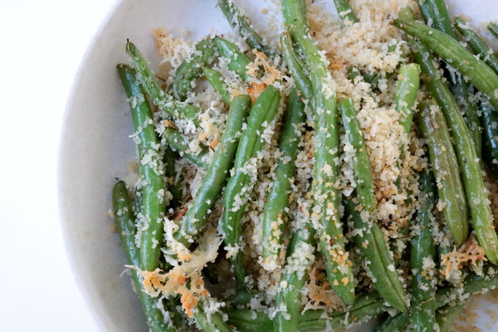 I said earlier this month that I’m working on cleaning out my pantry. It’s a good start of the year project, even if it will probably take several months. But I also signed up for Hungryroot, which it a weekly meal kit/grocery service. I’ve enjoyed doing it, and I think the system works pretty well together. I can get fresh and more interesting meals for most of the week with Hungryroot, and then work through my pantry on the other days. I also can just get groceries from Hungryroot – like these green beans. And then I can use up pantry ingredients – like breadcrumbs – to make roasted green beans. Everything gets used up!