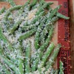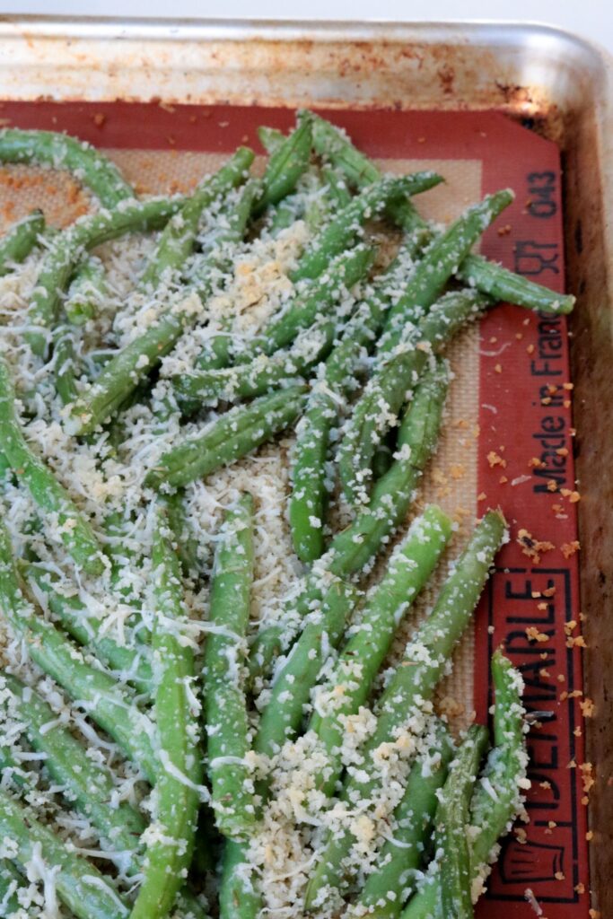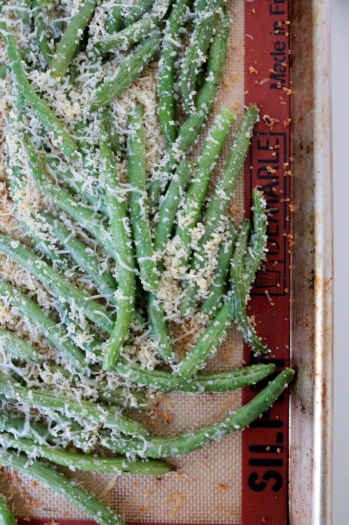 - Place beans evenly in one layer on the baking sheet being careful not to pile them on each other. Sprinkle any of the remaining Parmesan and Panko from the bowl over the beans.