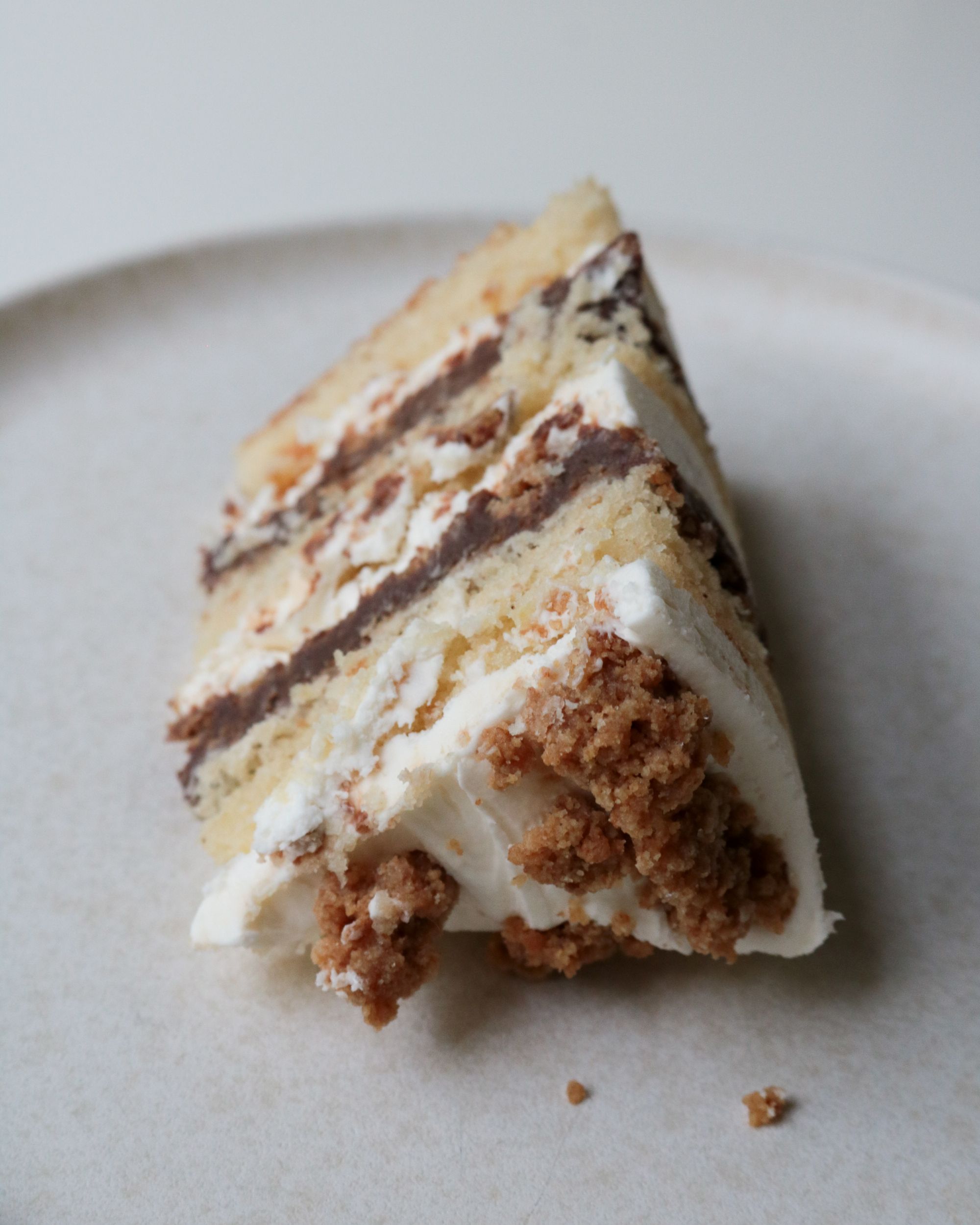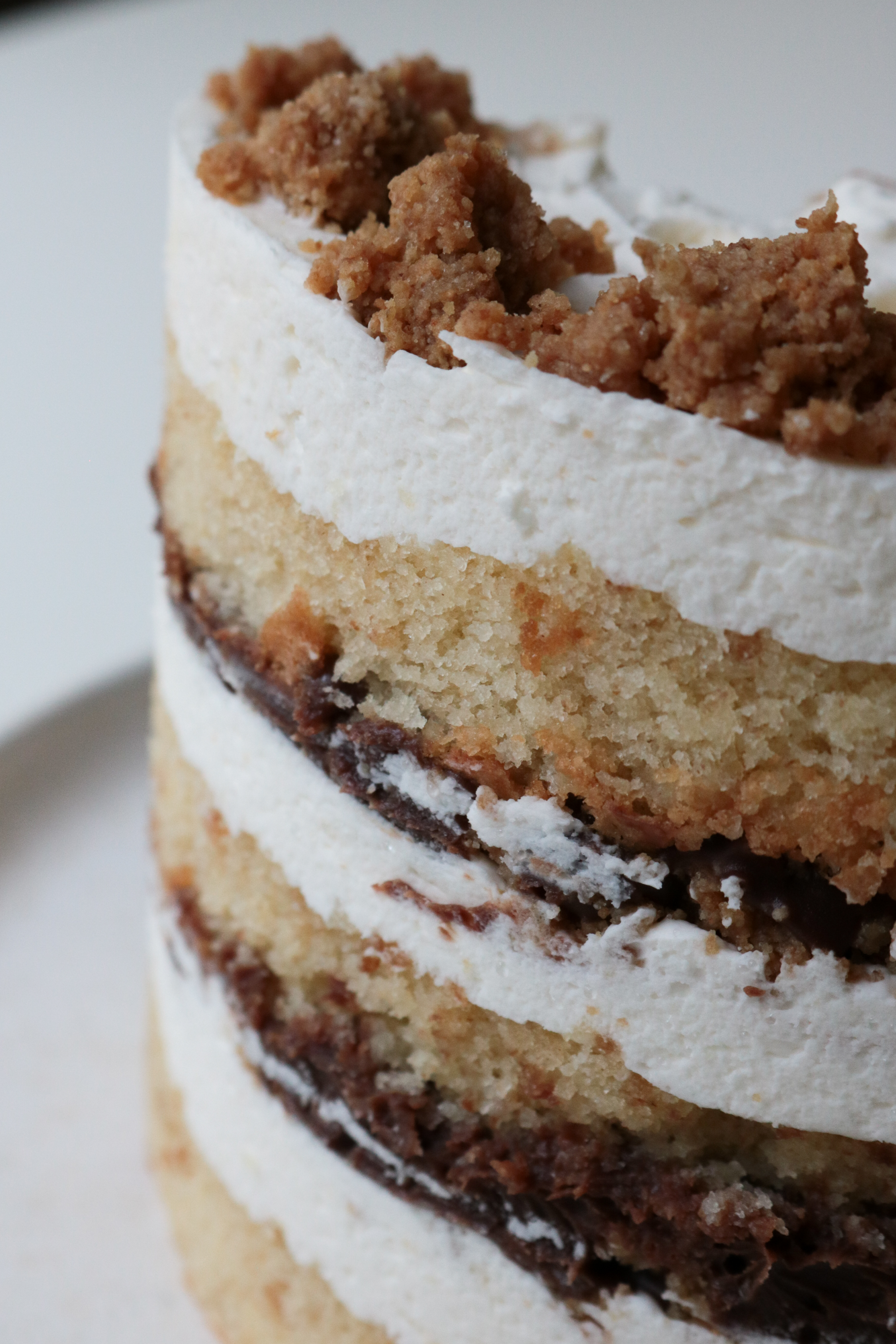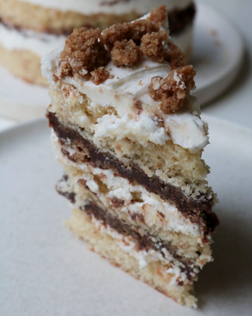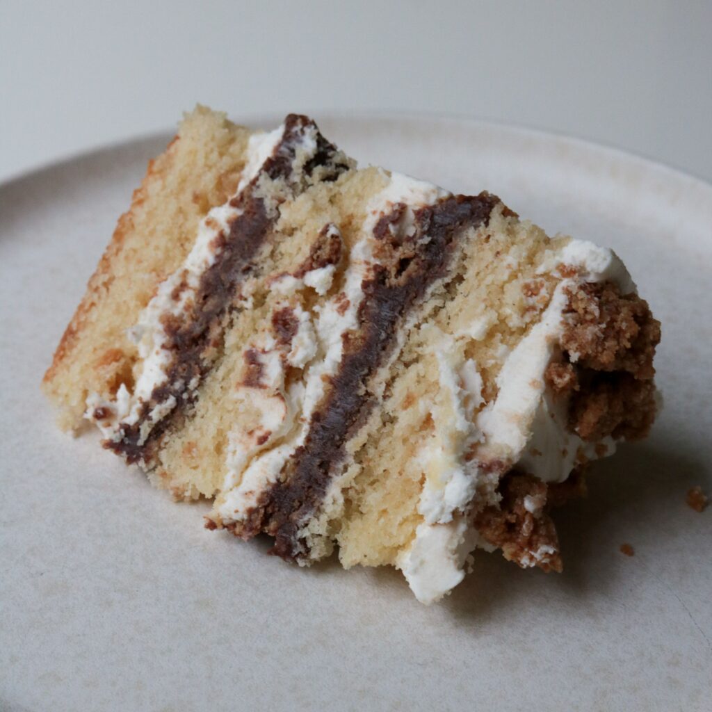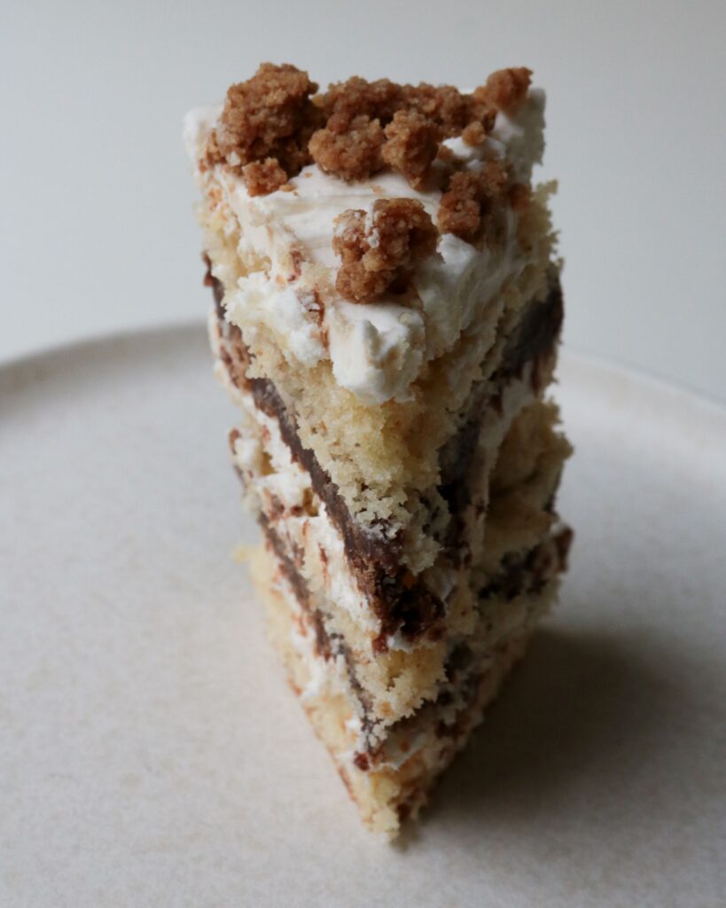 This cake follows the Milk Bar formula, naturally, because I don’t like to mess with a good thing. But it’s not one of the official Milk Bar recipes. It’s got graham cracker cake, graham crumb, Hershey ganache, and marshmallow frosting. Not having the frosting on the outside keeps the marshmallow at a good level, and that combines with the salt in the graham crumb and cake makes the whole thing not too sweet. Which is a big thing when it comes to S’mores, in my opinion! Because they can easily become far to sweet, between the marshmallow and the milk chocolate.